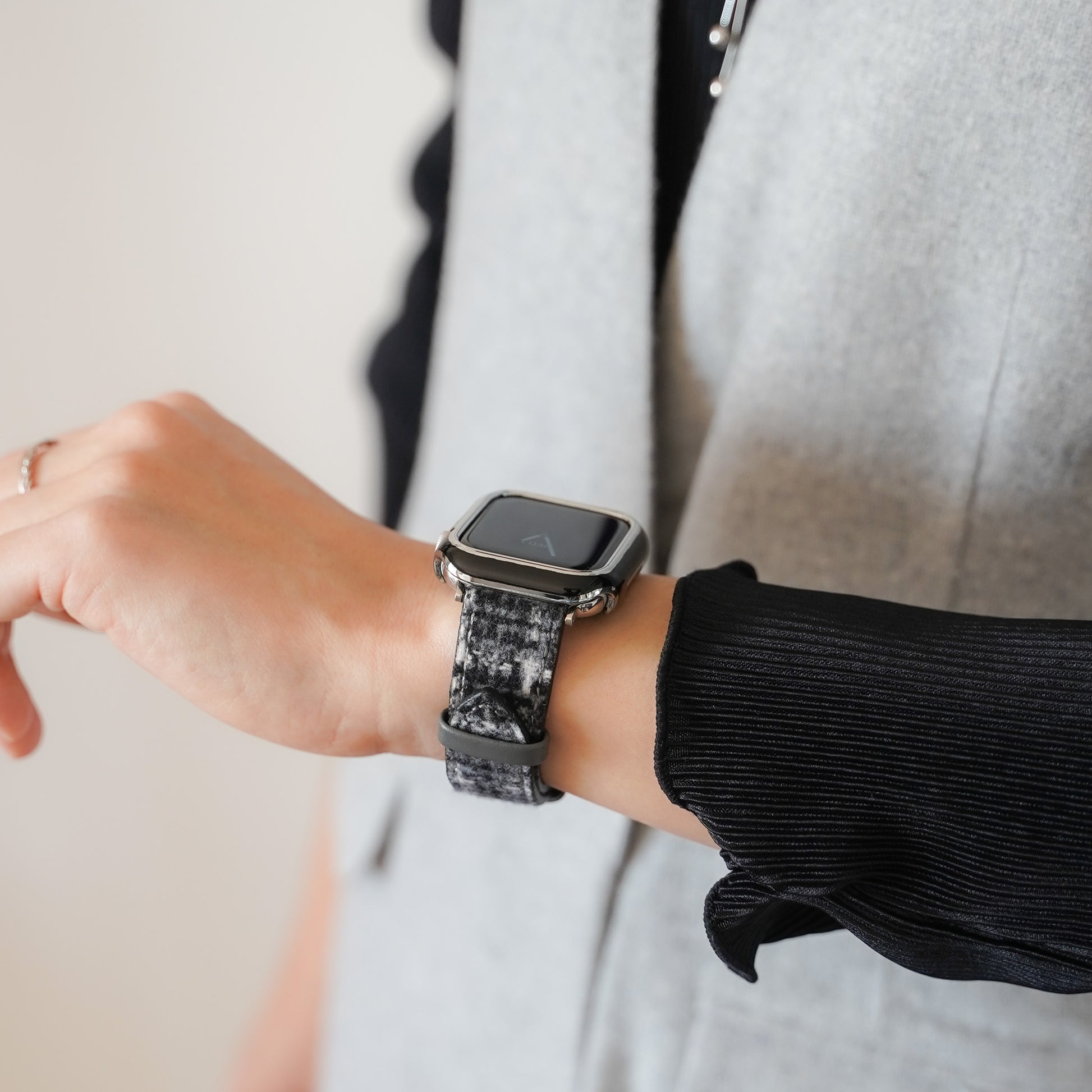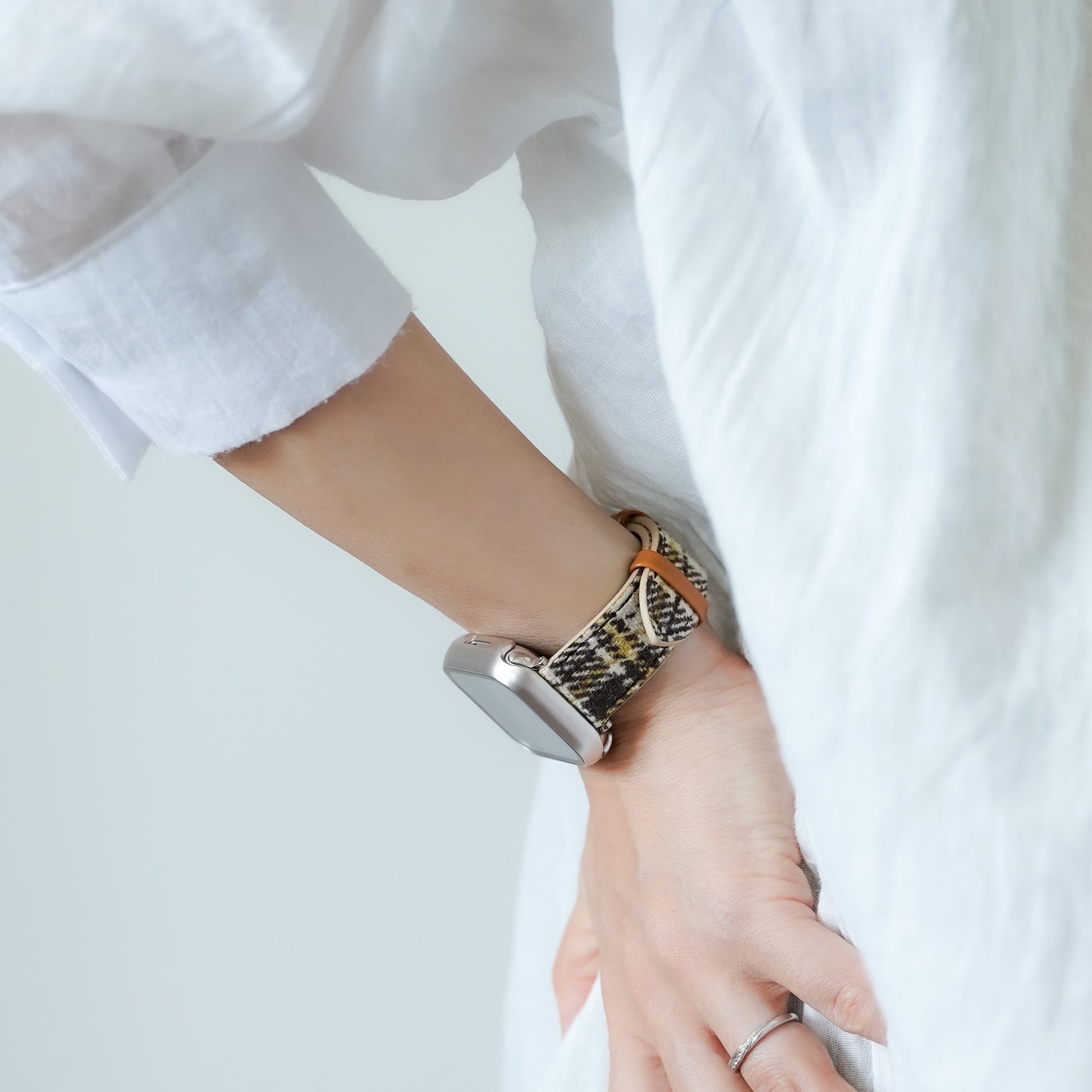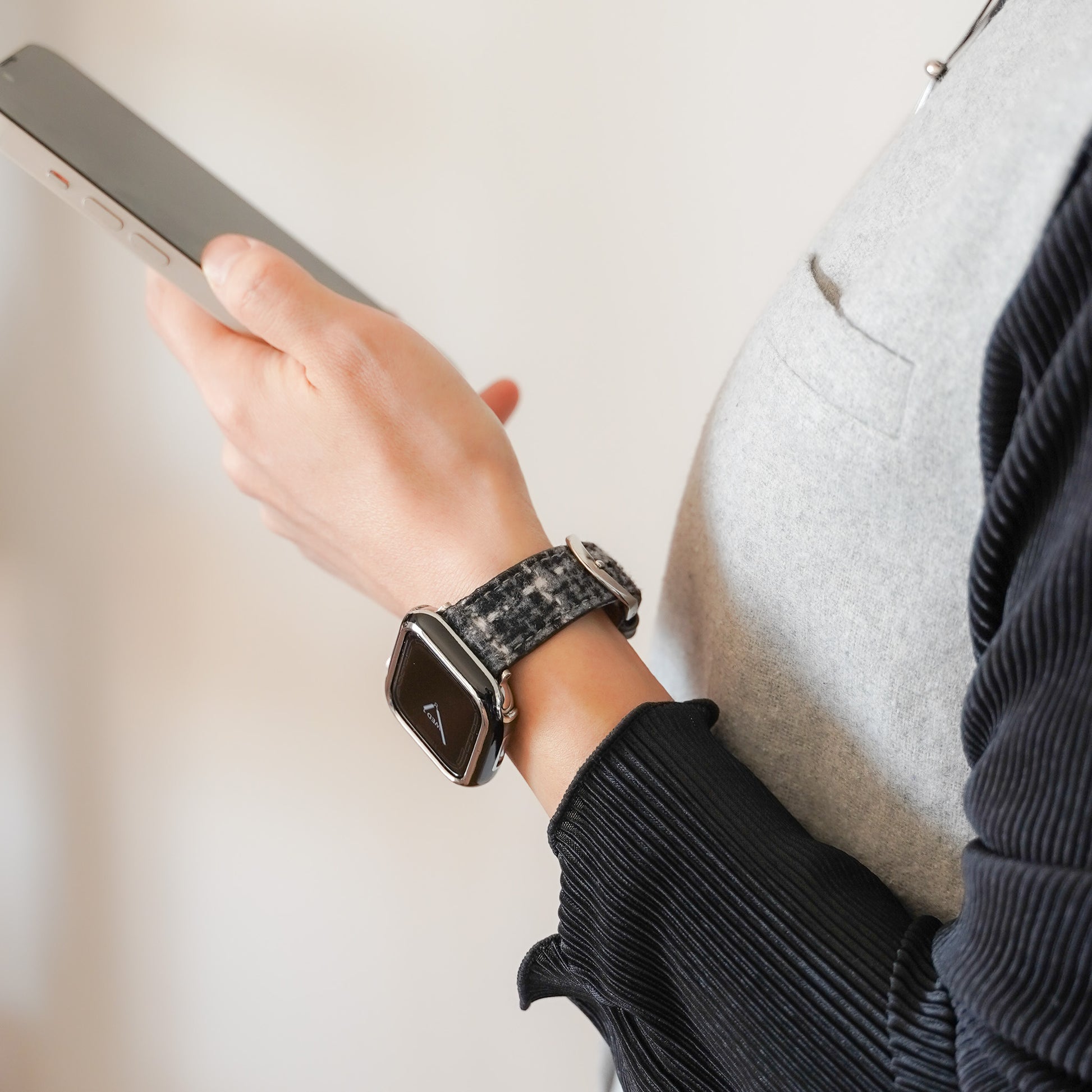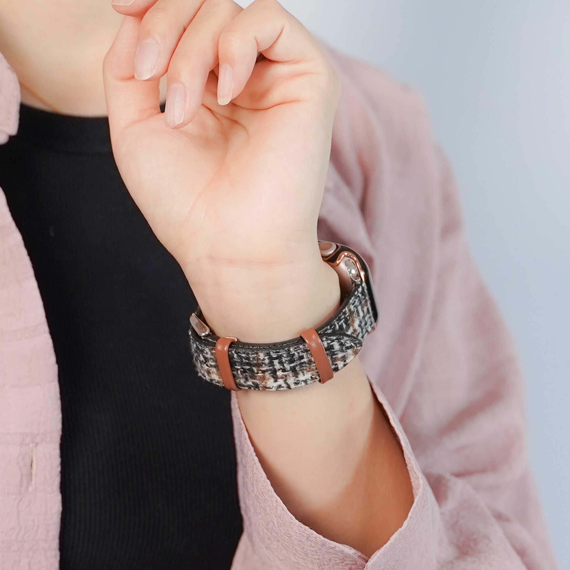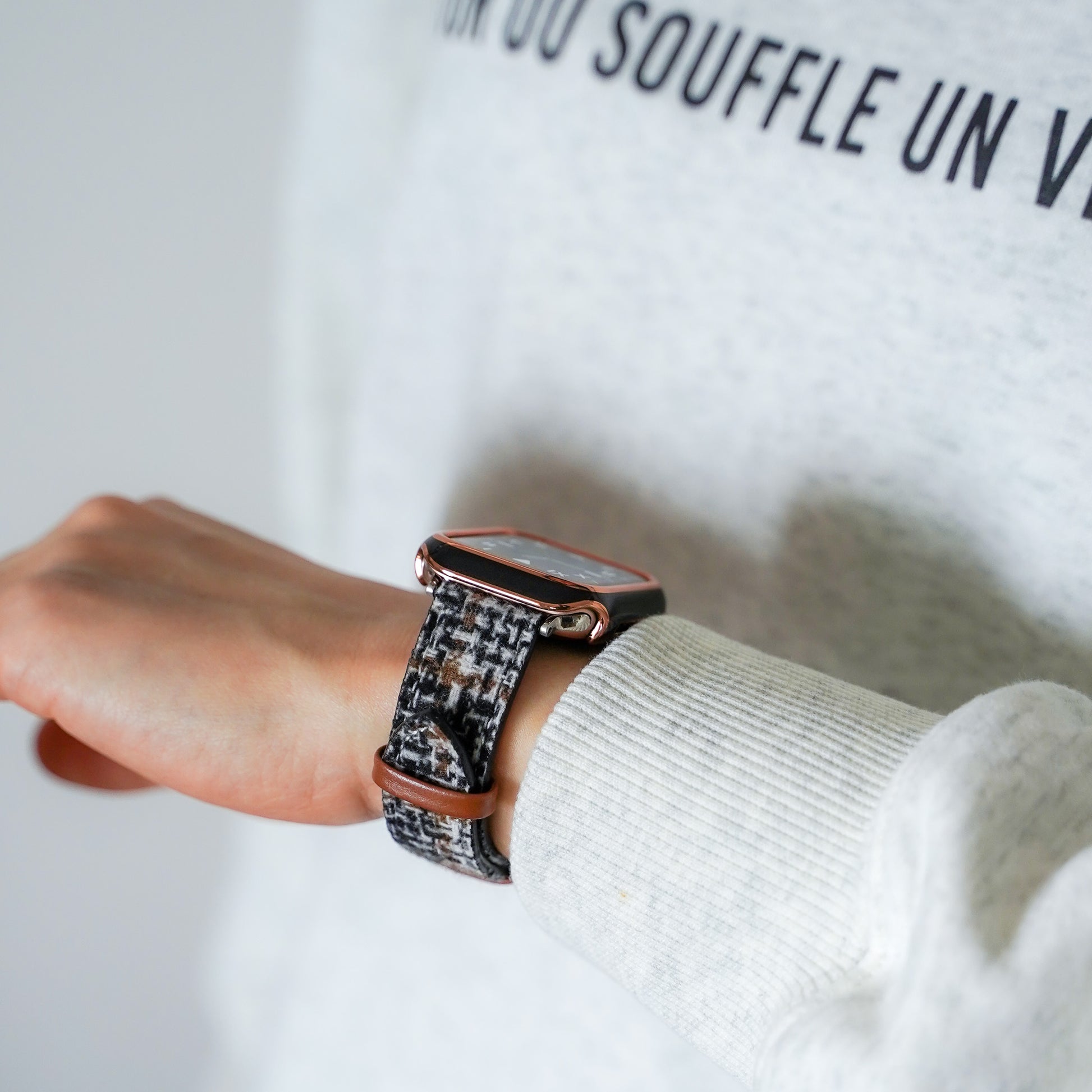 A cute apple watch band with a checkered pattern that combines tweed fabric and leather.