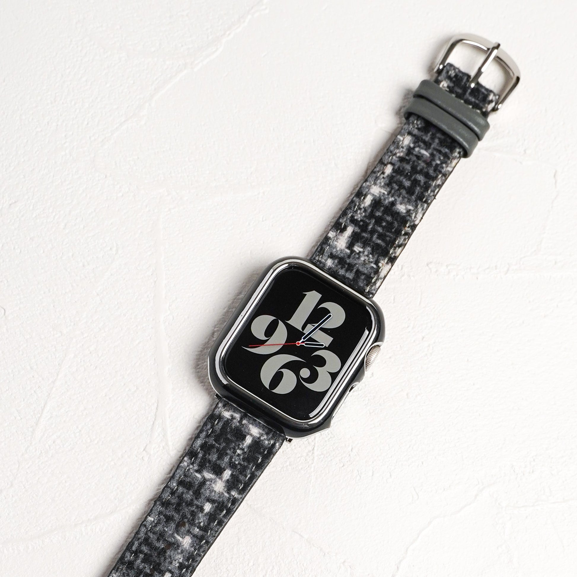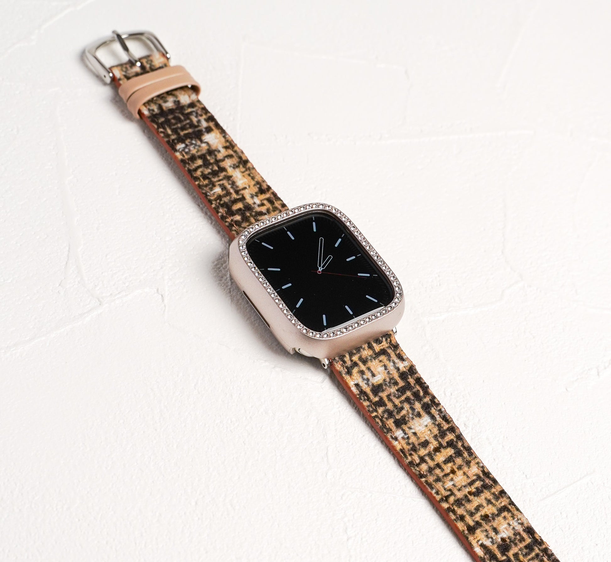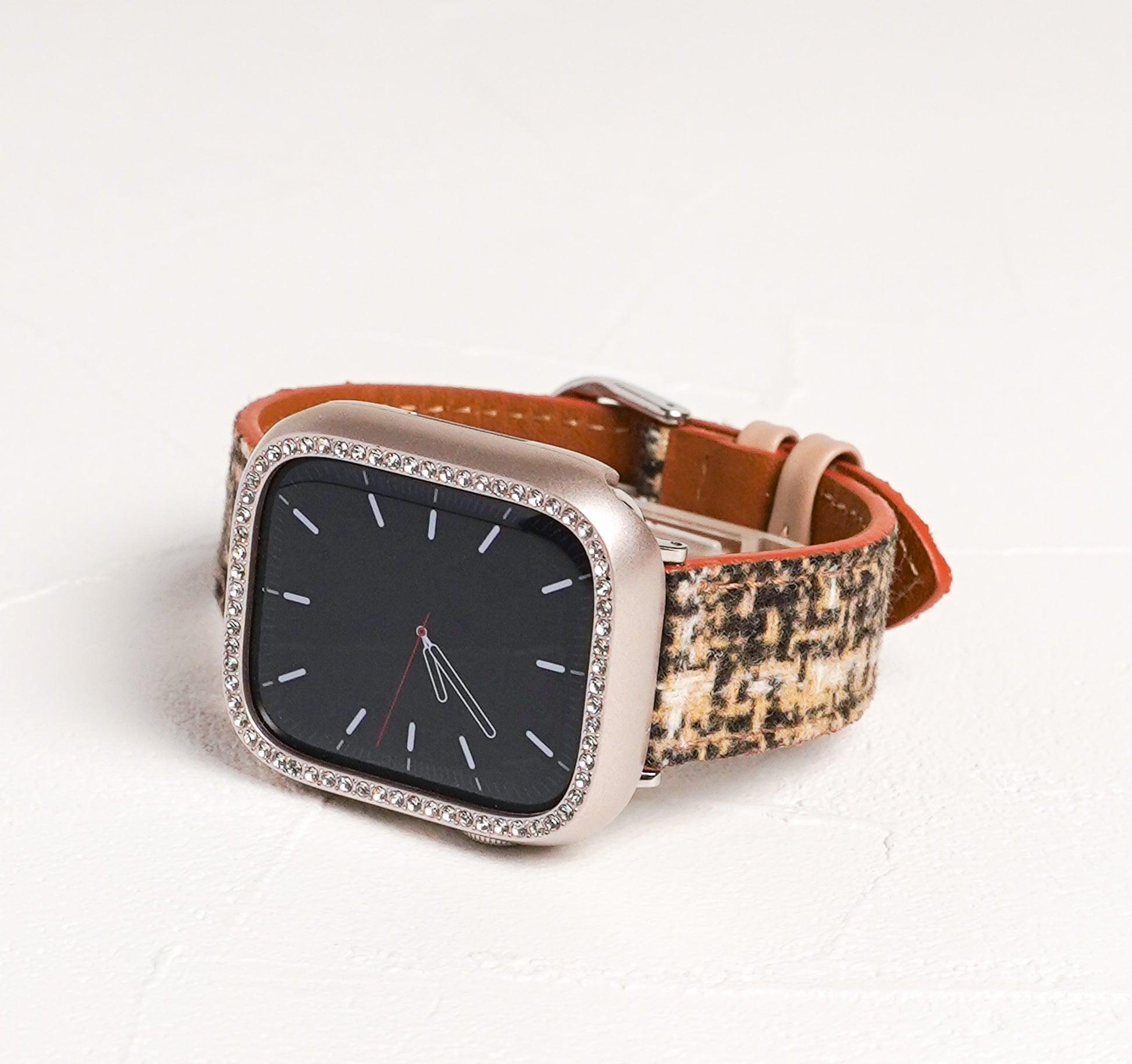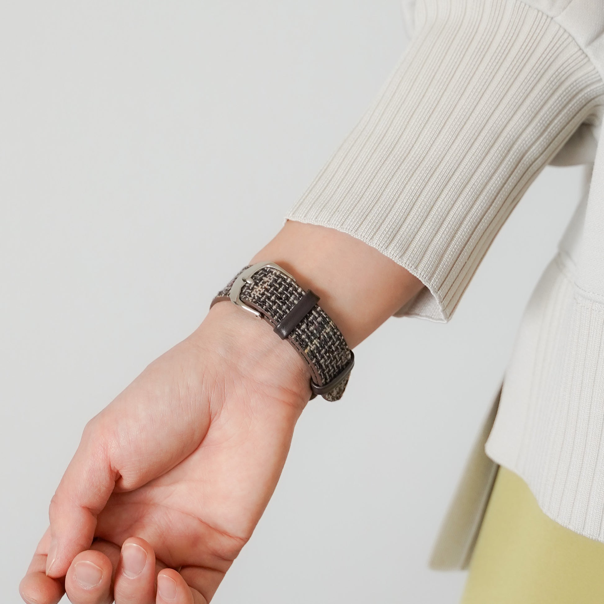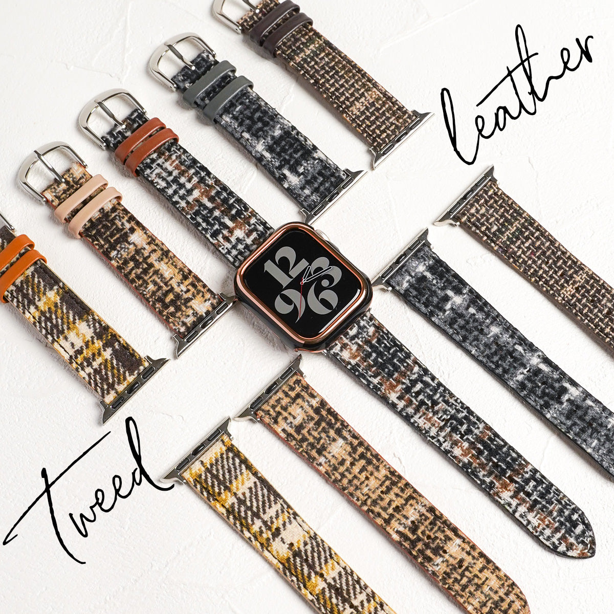 A cute apple watch band with a checkered pattern that combines tweed fabric and leather.