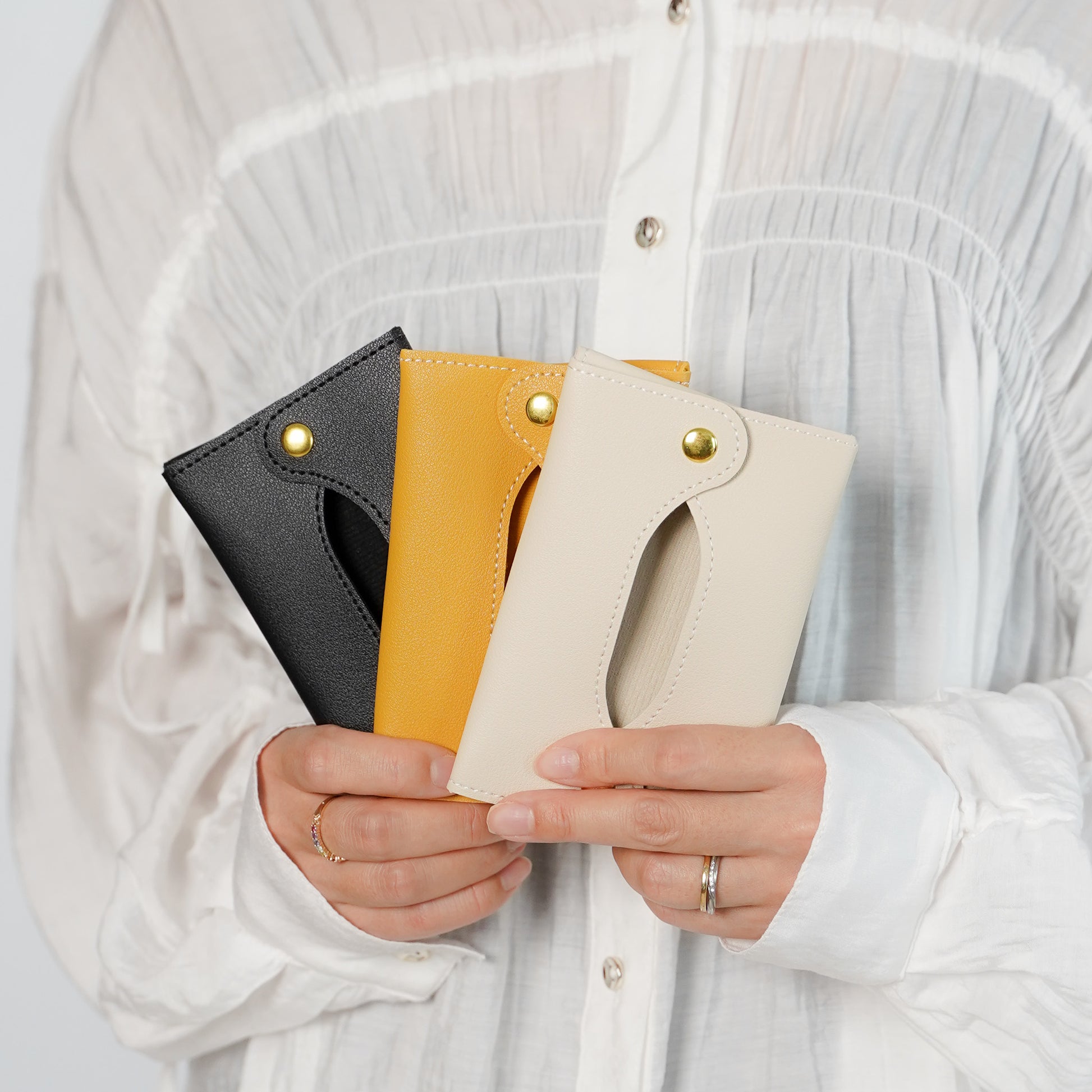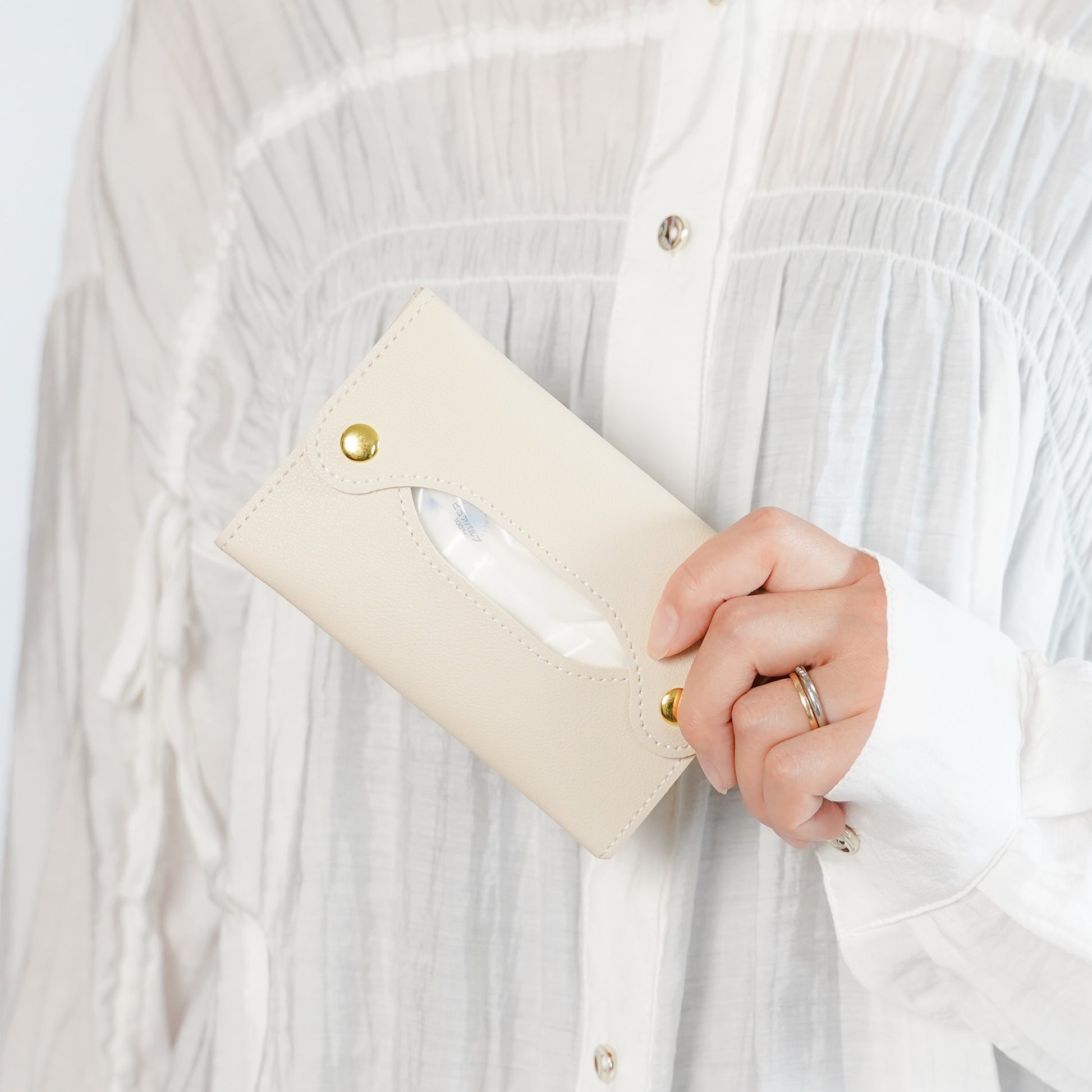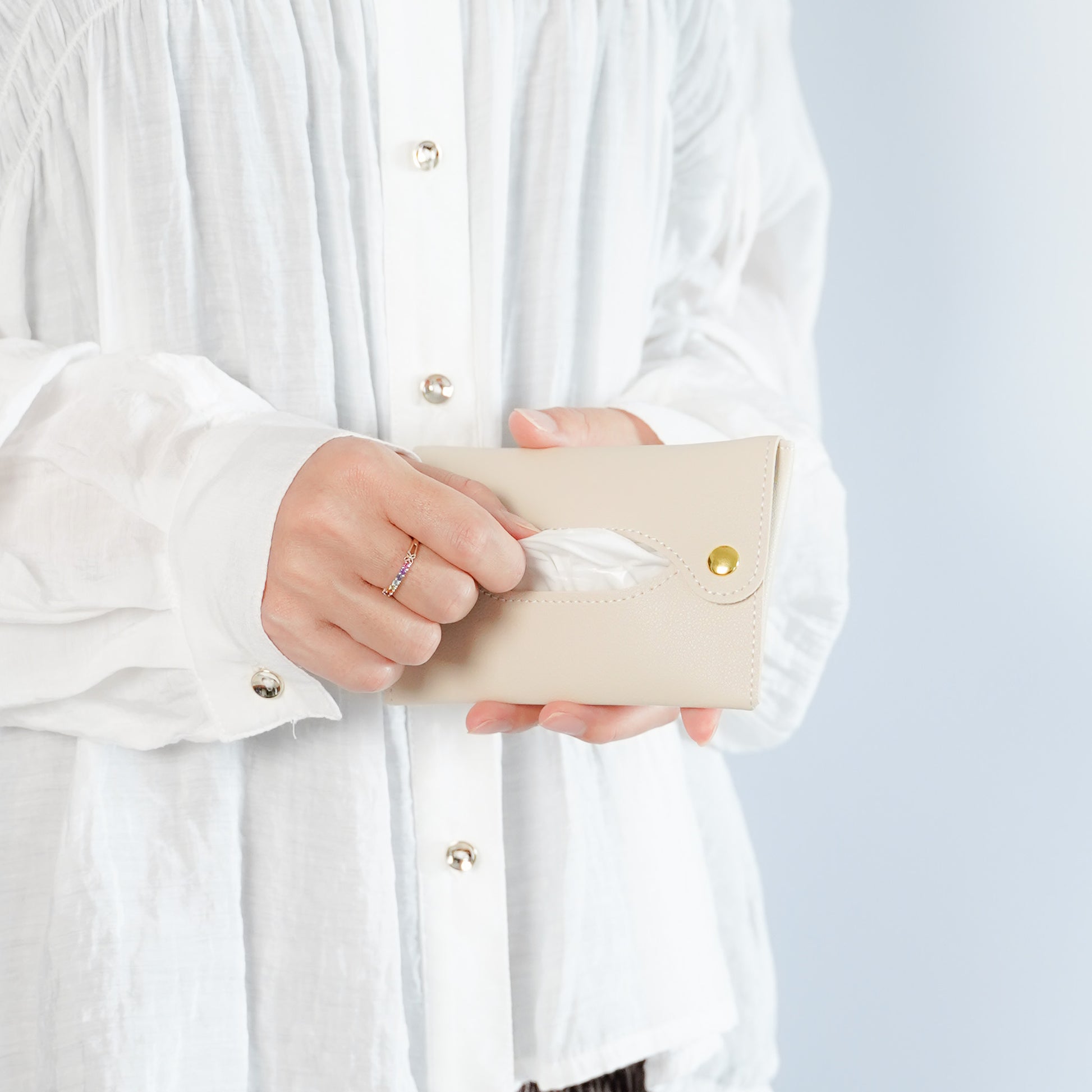 柔らかなPUレザー素材を使った、ポケットティッシュ専用カバーです。